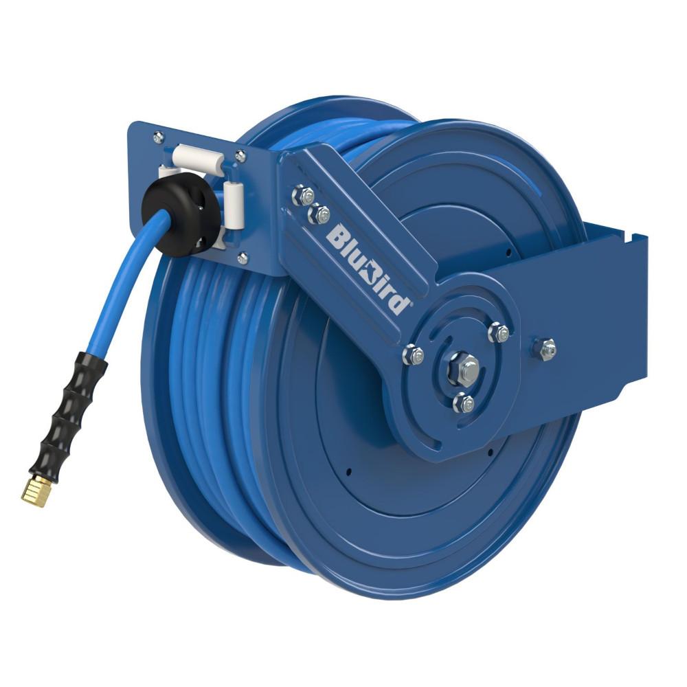 - Slangupprullaren »BluBird« är en tryckluftsslangupprullare med ett öppet, pulverlackerat stålhölje och en integrerad massiv gummislang (Ø 20 × 13 mm) med en längd på 15 m och en G 1/2 invändig gänga.