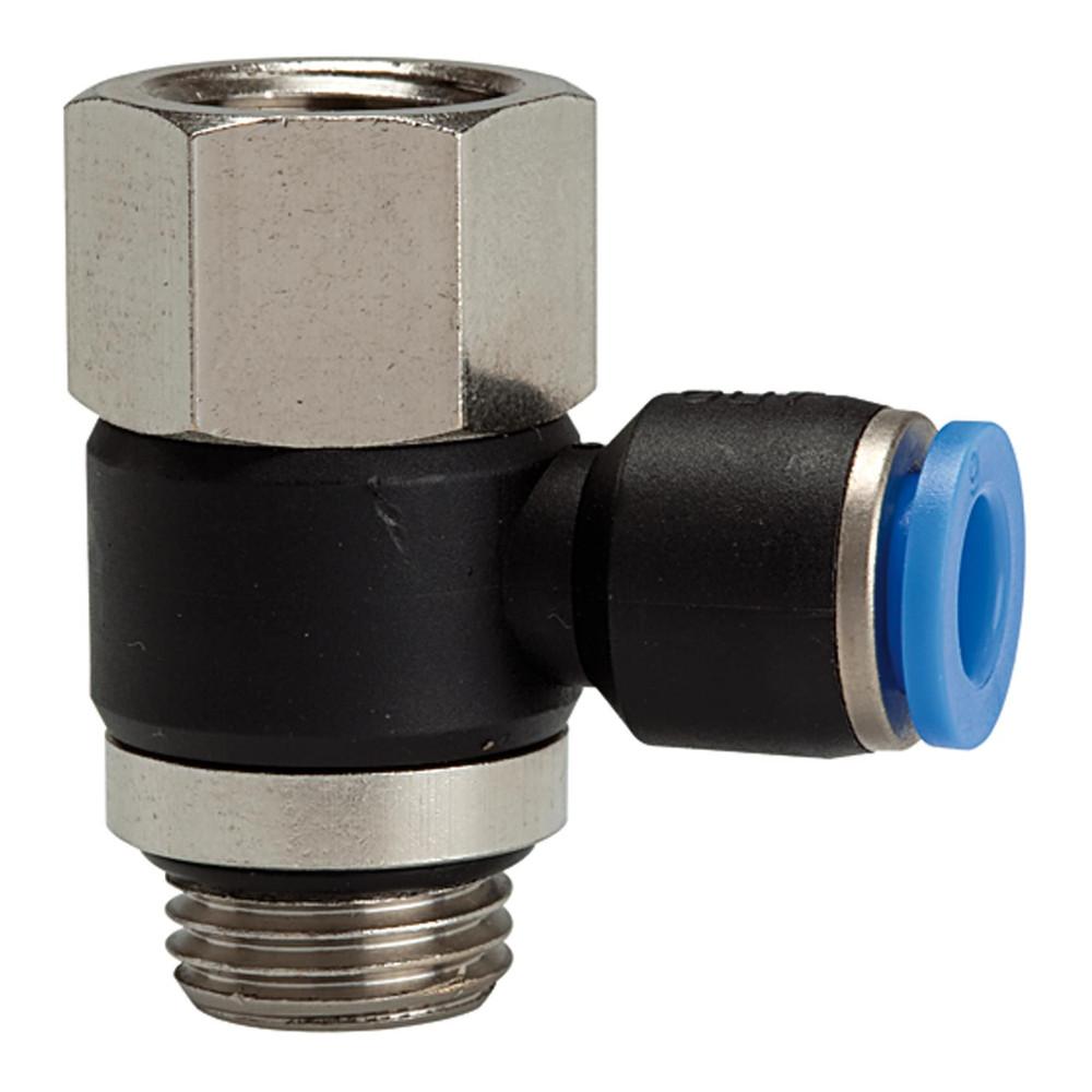 - L-formad instickskoppling är lämplig för rätvinklig, roterbar anslutning av tryckluftsslangar mellan pneumatiska anslutningar med invändig och utvändig gänga.