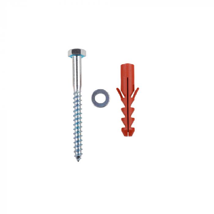 - Skruven och brickan är tillverkade av förzinkat stål, pluggen är tillverkad av PVC.