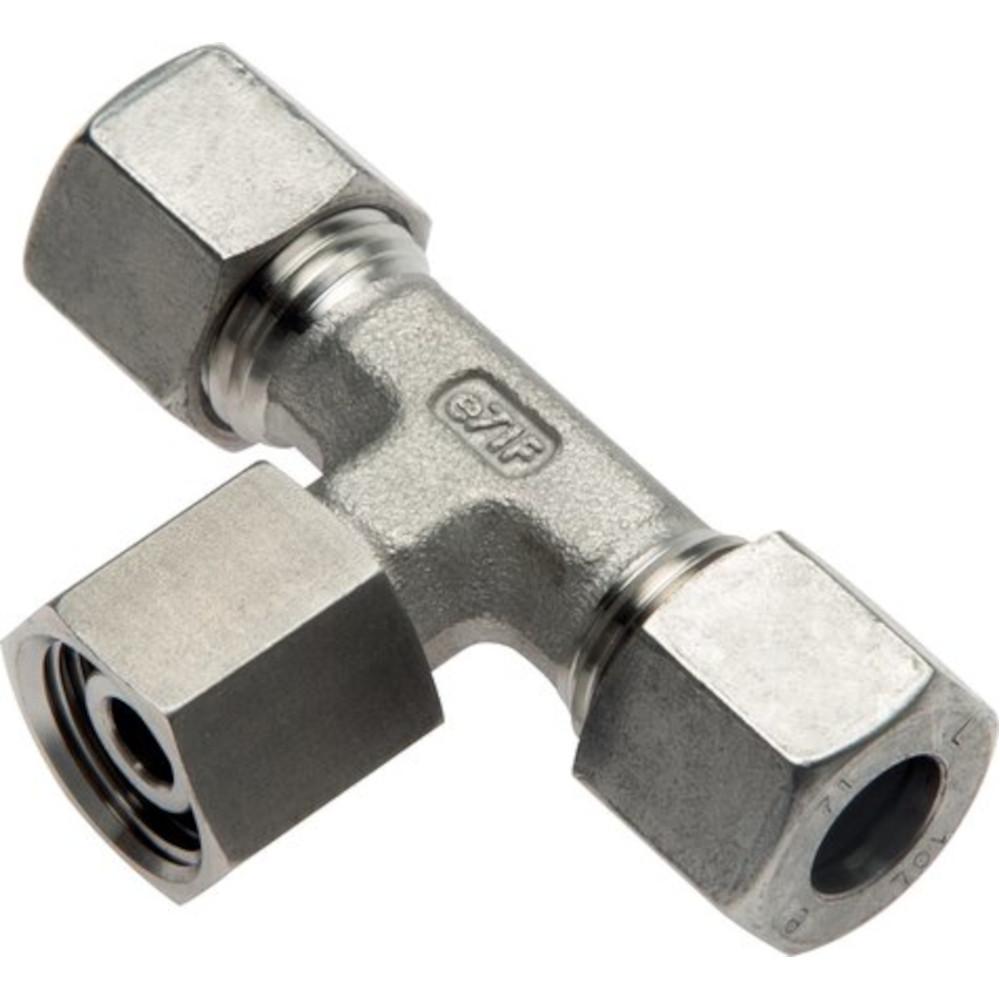 - T-kopplingen i rostfritt stål används för tillverkaroberoende anslutning och förgrening av rörledningar i hydrauliska och fluidtekniska system.