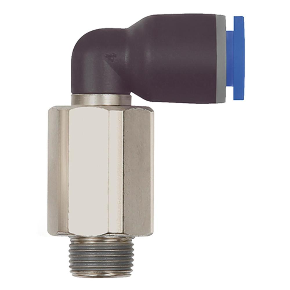 - L-formad instickskoppling "Blue Series" lång, vridbar, med R-utvändig gänga används för rätvinklig anslutning av tryckluftsslangar till pneumatiska gänganslutningar.