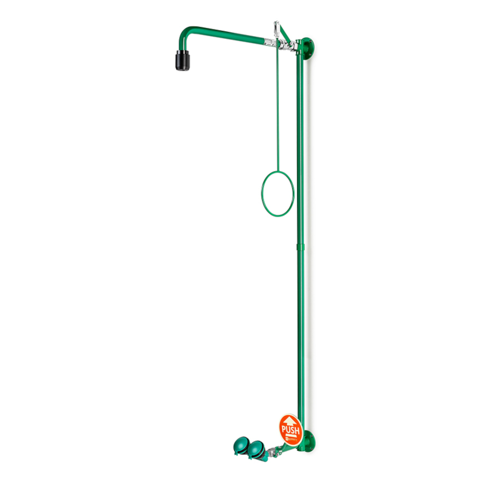 - Kroppsduschen aktiveras via en dragstång med ett ringhandtag, medan ögonduschen utlöses via en PUSH-kontrollplatta.
