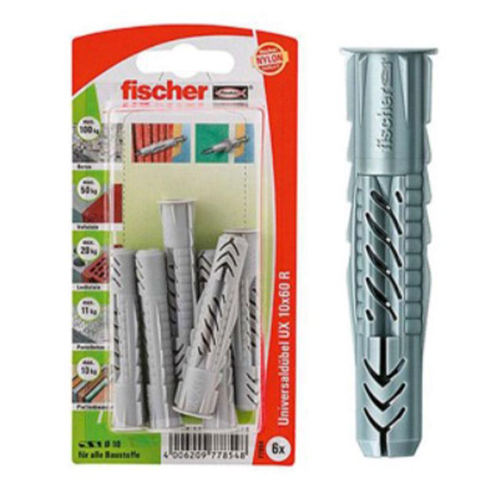 - fischer universalplugg är ett mångsidigt verktyg tillverkat av högkvalitativ nylon. Den gjutna kanten är praktisk. Detta förhindrar att pluggen glider in i borrhålet när den sätts i. De vinklade anslutningsskenorna på UX säkerställer optimal skruvstyrning. Sågtandsformade vridsäkringar förhindrar rotation i borrhålet, vilket garanterar maximal installationssäkerhet. Fästsatser med skruvar, öljetter och krokar erbjuder rätt lösning för alla applikationer.